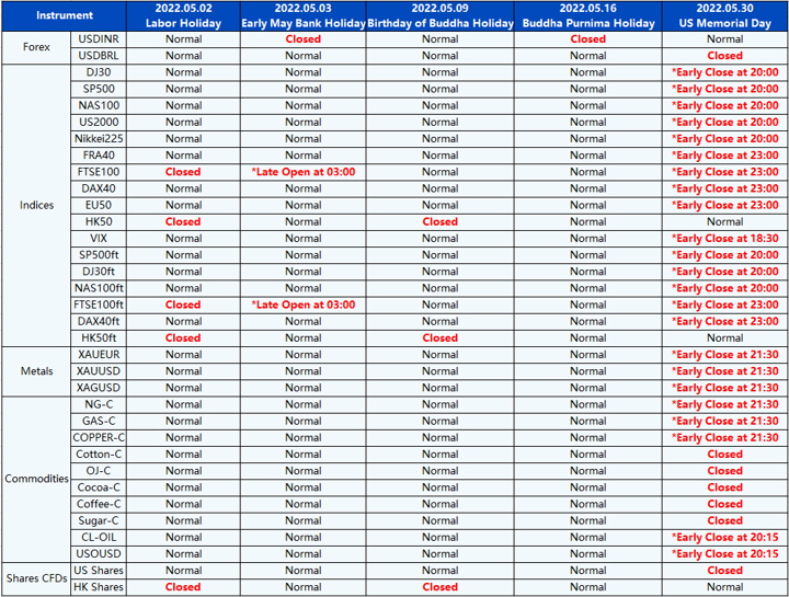 Please be advised that the following instruments’ trading hours and market session times will be affected by the upcoming May holidays.