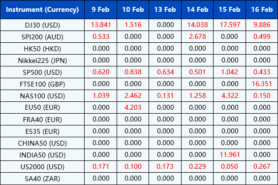 Please be advised that the dividends of the following index CFDs will be adjusted by upcoming ex-dividend dates. The comment for trading index CFDs will be in the following format “Div&<Product Name>&<Net Volume>” which show in the balance after the close of the day before the dividend payment date.