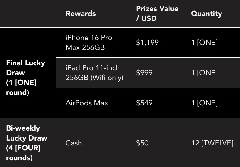 *Each Bi-weekly Lucky Draw will select 3 [THREE] clients, with each client receiving $50 USD cash.